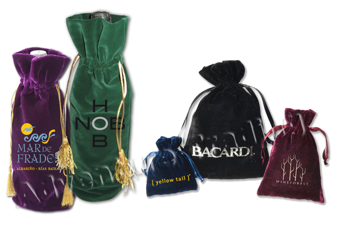 Velvet Wine Bags and Accessory Bags: Customize these high quality velvet wine bags with your logo or message. Velvet bags come in various primary colors. Two tassles hang on sides and top can be cinched tight. Screen print or embroider your logo.